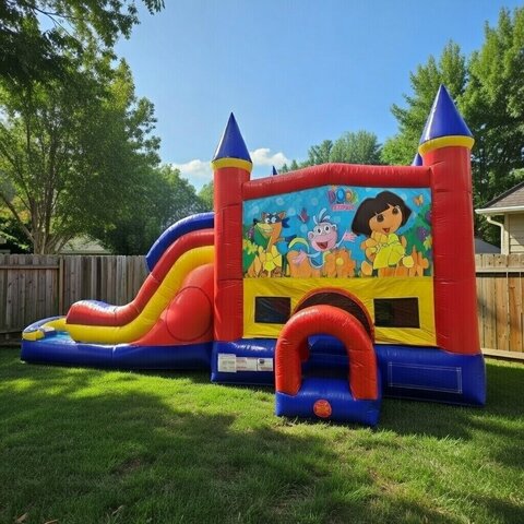 Embark on an epic adventure with the **Dora the Explorer Double Lane Water Slide with Bounce House** rental! Join Dora, Boots, Swiper, and friends in this explorer-themed combo packed with a large jumping space, interactive obstacles, basketball hoop, climbing wall, and double racing water slides ending in a splash-filled pool. Great for themed birthdays, school events, and outdoor explorations that spark imagination and excitement.