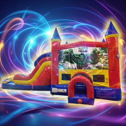 Rent the ultimate Hulk bounce house combo with double lane water slide in Spanish Fort AL, Daphne, Fairhope, Loxley, Silverhill, Robertsdale, Bay Minette, Foley, and Gulf Shores AL! Eastern Shore Inflatables brings Hulk-sized smash excitement to your next event with this action-packed Incredible Hulk inflatable wet/dry combo.